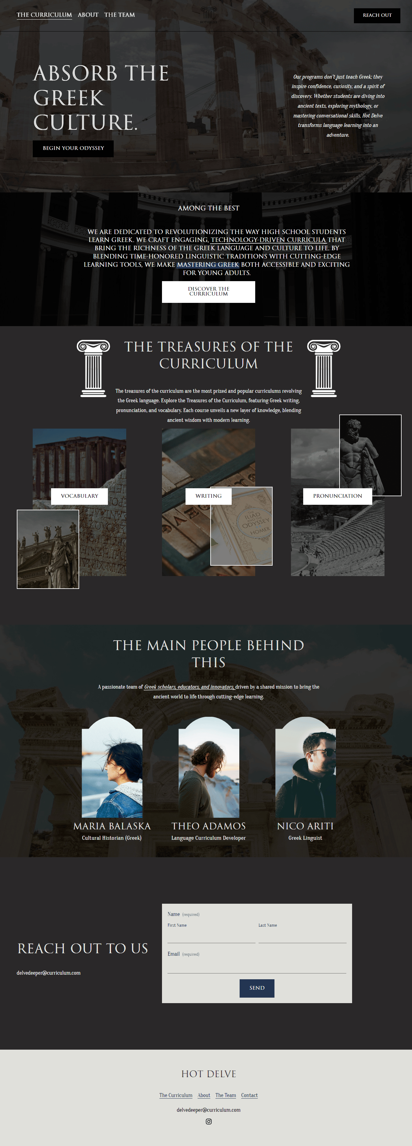 Hot Delve, a curriculum for learning Greek, wanted a website primarily focused on providing essential information to improve search rankings. In addition to the landing page, they wanted to include an information page, a course listing page, and a simple contact page. They wanted to feature an 'About the Team' section with the display of the members on the landing page, but have it more detailed in a dedicated 'The Team' page They also wanted to encourage users to view the catalog. The client preferred a minimalistic design, with their brand color—dark gray—featured prominently, along with visuals to align with their vision and values.